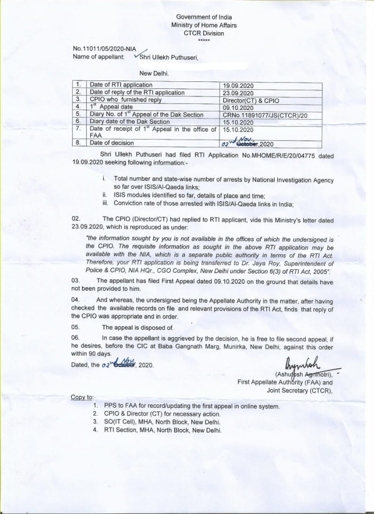 Meanwhile, I subsequently filed an appeal stating that details provided to the RTI application were unsatisfactory, but the appeal was shortly disposed of by Ashutosh Agnihotri, First Appellate Authority (FAA) and Joint Secretary, CTCR (Counter Terrorism and Counter Radicalization Division), which falls under the Union Home Ministry, on November 2, 2020. I was asked to file another appeal if I am aggrieved at the decision.