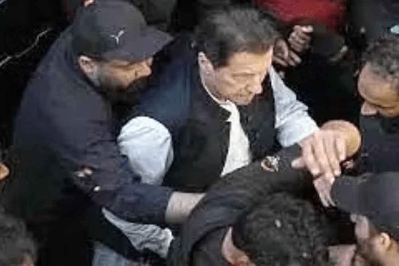 Former Pakistan Prime Minister Imran Khan being taken away by security personnel, Islamabad, May 9, 2023 (Source: PTI/Twitter)