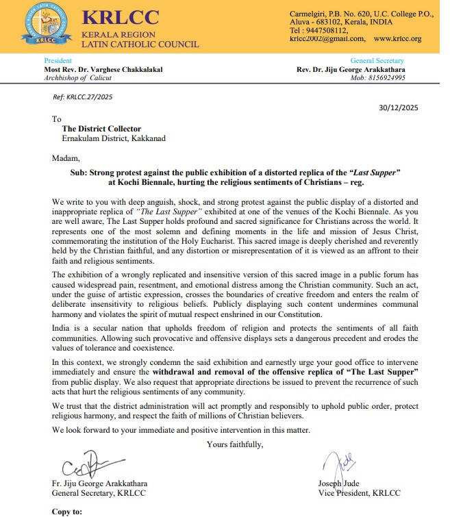 It added that the exhibition of a wrongly replicated and insensitive version of this sacred image in a public forum has caused widespread pain, resentment, and emotional distress among the Christian community. Such an act, under the guise of artistic expression, crosses the boundaries of creative freedom and enters the realm of deliberate insensitivity to religious beliefs, the letter added, emphasising that “publicly displaying such content undermines communal harmony and violates the spirit of mutual respect enshrined in our Constitution.